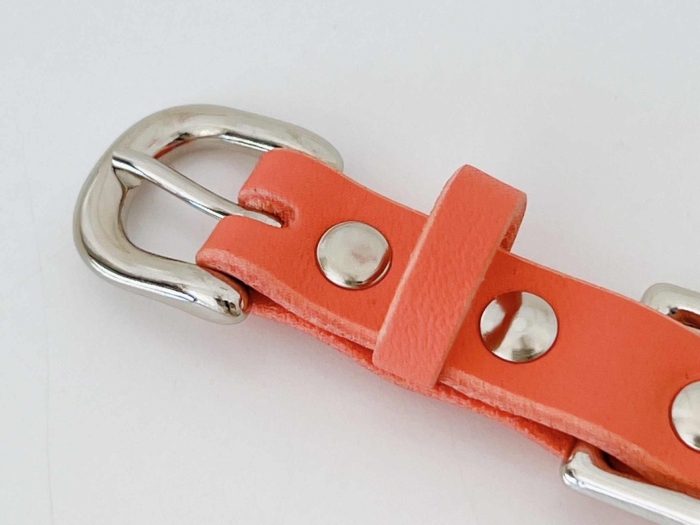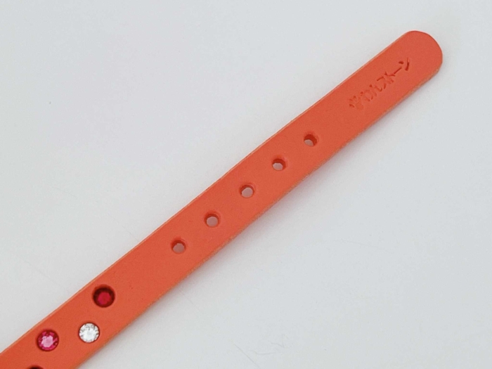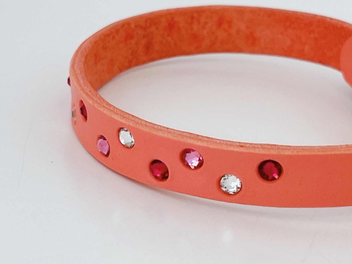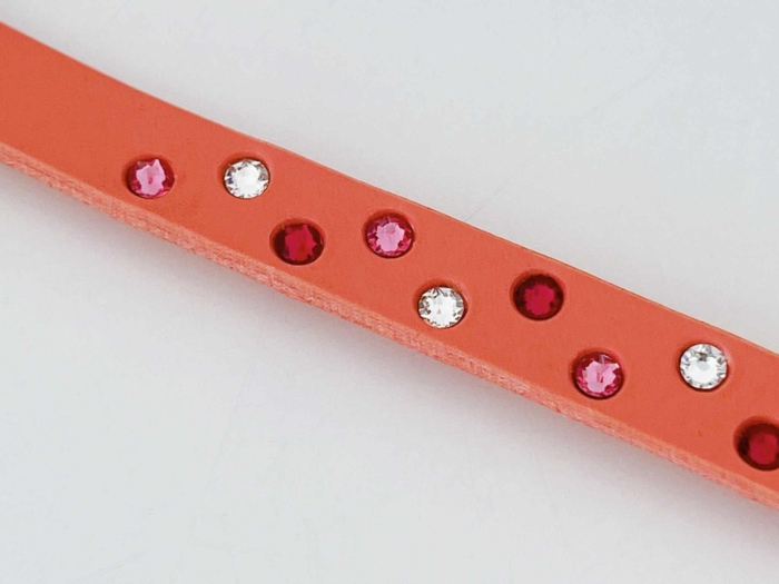 サーモンピンクレザーをベースに、レッド・ピンク・クリスタルのスワロフスキーが織りなす3色グラデーション。